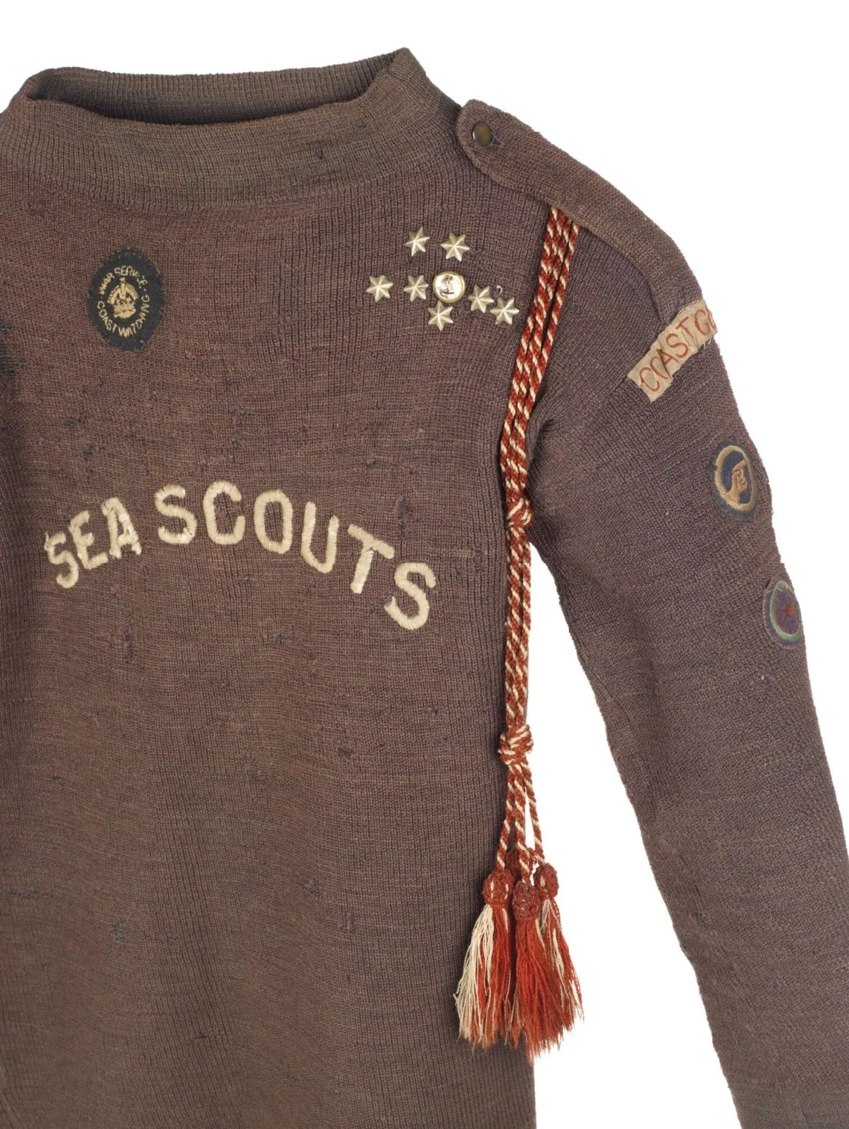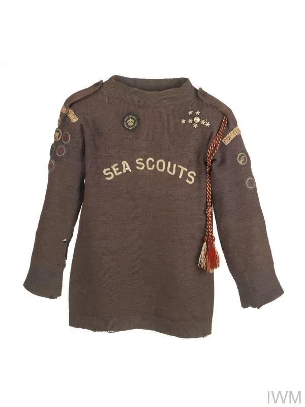 The most striking object left behind by this story is the jumper itself. The Sea Scout jumper worn during WWI borrowed its visual language from the Royal Navy, but it translated that language into knitwear. Heavy wool made sense for the job. You could stand on an exposed coastline and survive wind, damp, and cold without the stiffness of tailored cloth. The sailor collar framed the shoulders with a naval silhouette. The chest lettering, “SEA SCOUTS,” turned the body into a sign. Badges accumulated on sleeves and chest as a record of skill and duty, stitched by hand, slightly irregular, deeply personal.