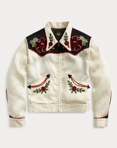 Cropped at the waist, embroidered across the chest in looping florals or sharp arrow motifs, cut in fluid rayon gabardine that moves like stage curtains . More than ranchwear, it was California inventing its own version of the American West.